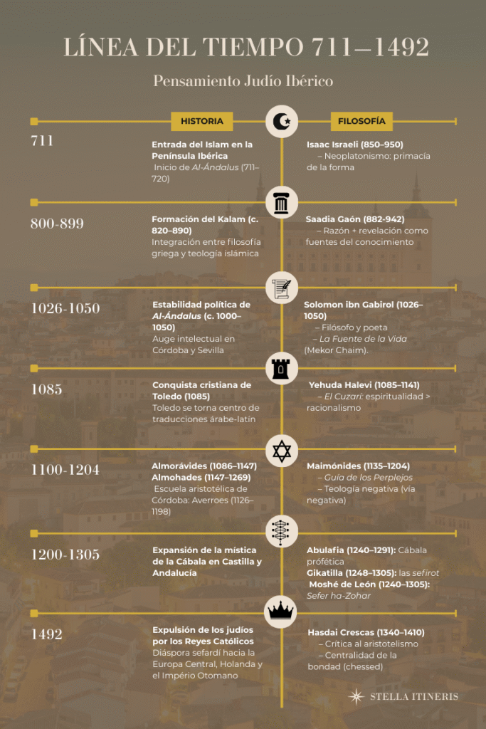 Este breve preámbulo ya nos brinda un elemento importante para imaginar una tensión. El pensamiento judío parece ser parte de un resultado entre las tensiones de los pueblos que lo rodean y una tensión de su propia existencia, pues una forma antigua de pensamiento antijudío afirma que el judío es un pueblo que solo copió a los pueblos a su alrededor. Sin embargo, si esto fuera cierto, ¿cómo entonces tendríamos tantas diferencias entre las tres grandes culturas ibéricas? Cuando el islam se instala en la península ibérica vemos el florecimiento de una gran escuela de pensamiento llamada Kalam, un intento de conciliar las doctrinas teológicas con el pensamiento abstracto proveniente de la filosofía griega ya en el siglo IX. Ese desarrollo serviría para que el islam pensara cómo ejecutar mandamientos coránicos que no estaban claramente definidos ni en el libro sagrado ni en los hadices —dichos y hechos del Profeta Muhammad. Inevitablemente, este acontecimiento llegó hasta la cultura judía ibérica ya en pleno desarrollo y en paz con las dinastías islámicas mediante el pago de impuestos para su permanencia allí.